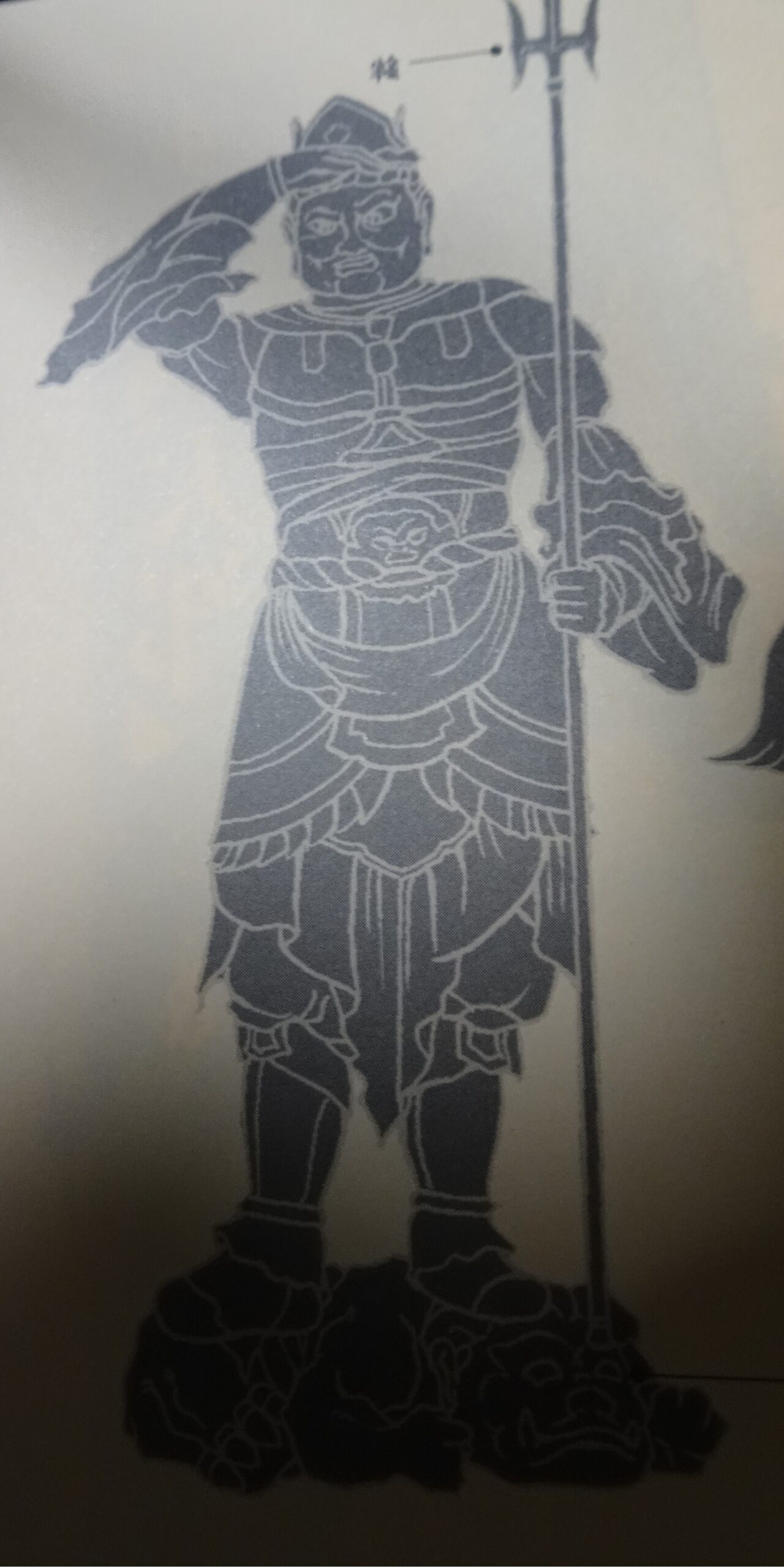 これは毘沙門天です。昔買った『仏像の本』から写真に撮ってアップしてます。下の方が暗くなっちゃった。暗くて見えないけどむりやり見ておくれ。